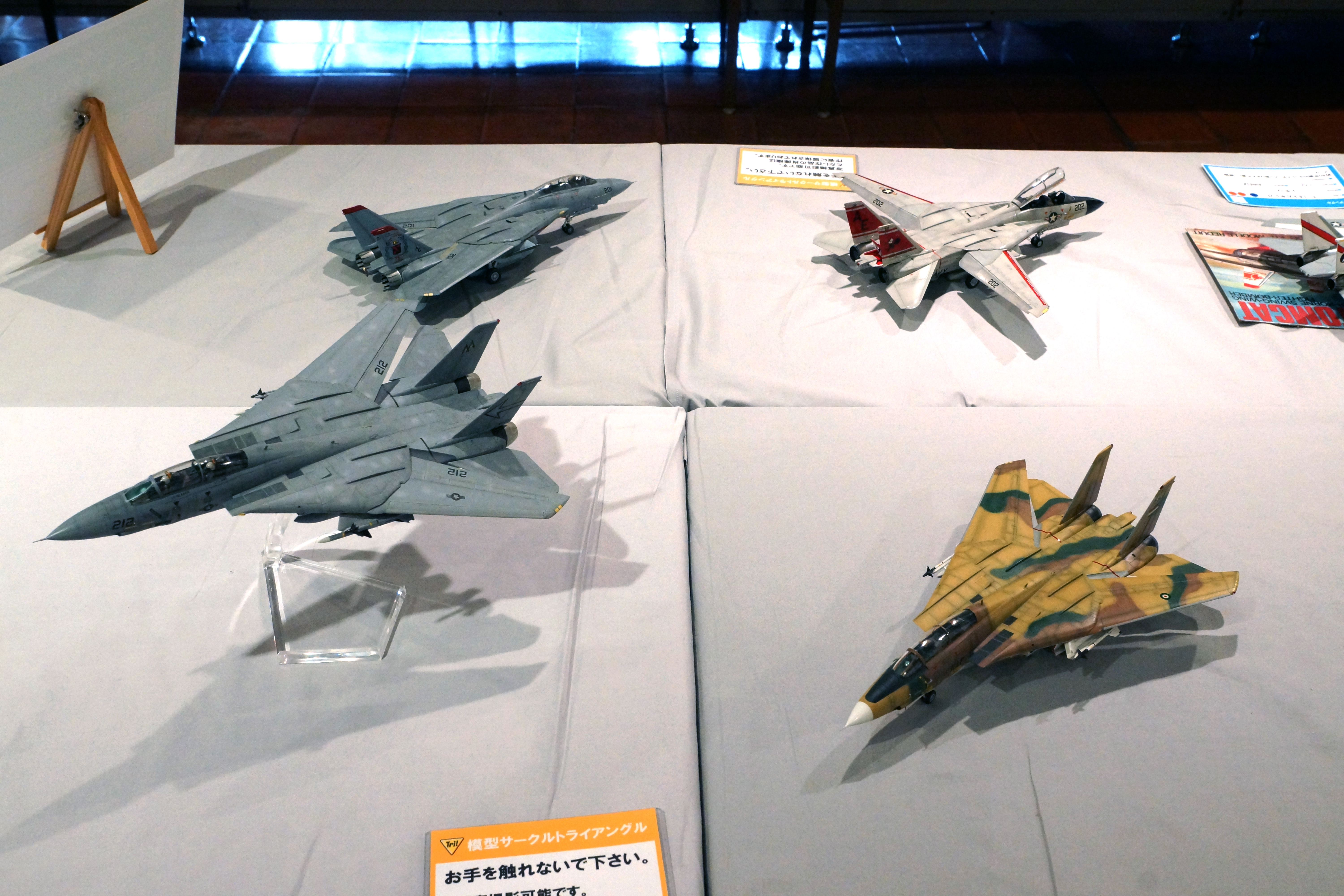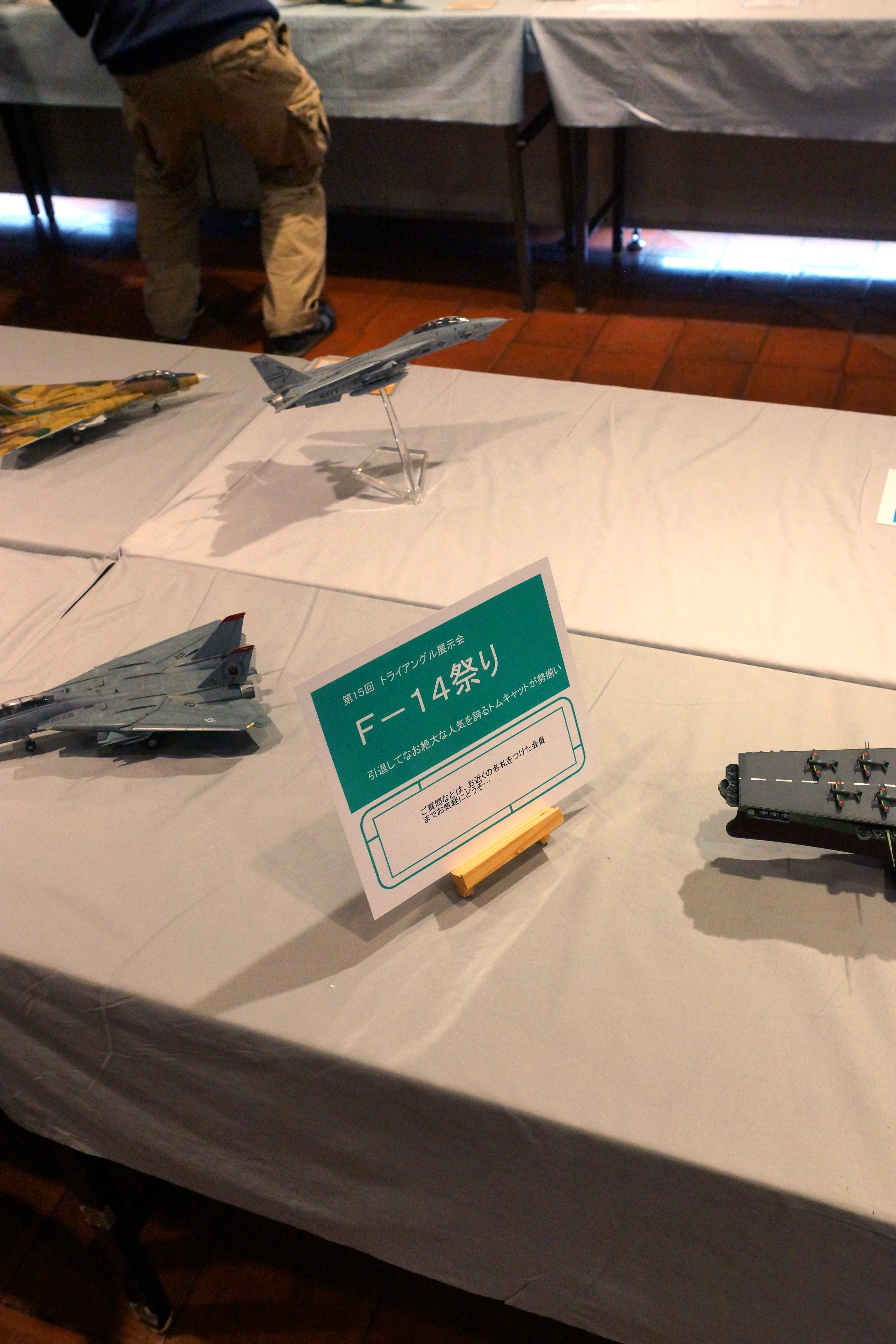 展示スペースは中央に置かれたテーブルの半分を使ってメインテーマの”「新製品」をつくろう”が展示されており、もう半分がサブテーマ “F-14祭り”となっています。