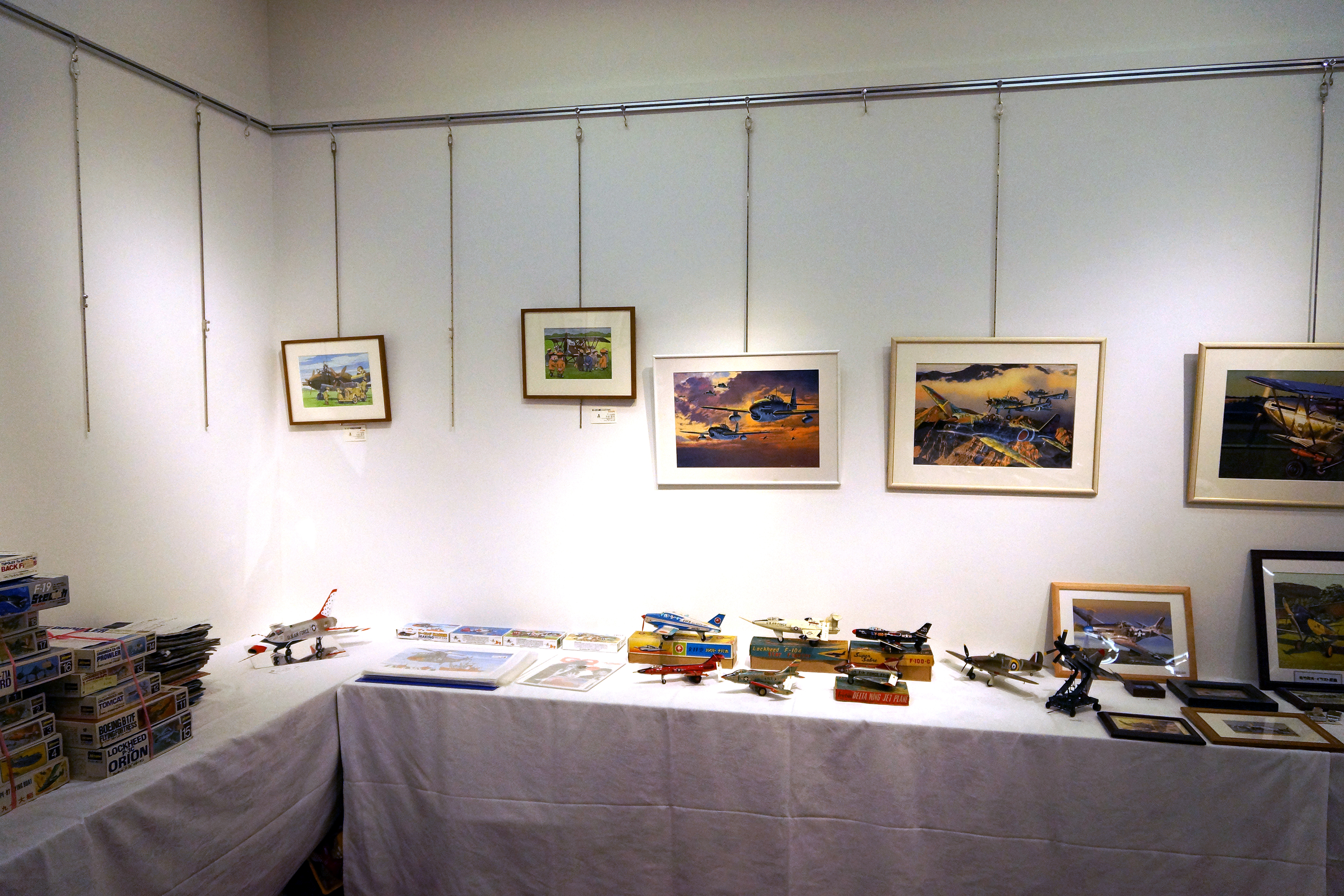 展示室右側の壁とテーブル。テーブルには松戸迷才会からの展示作品が並ぶ。ちょっと写っている中央のテーブルはTSMCの作品。