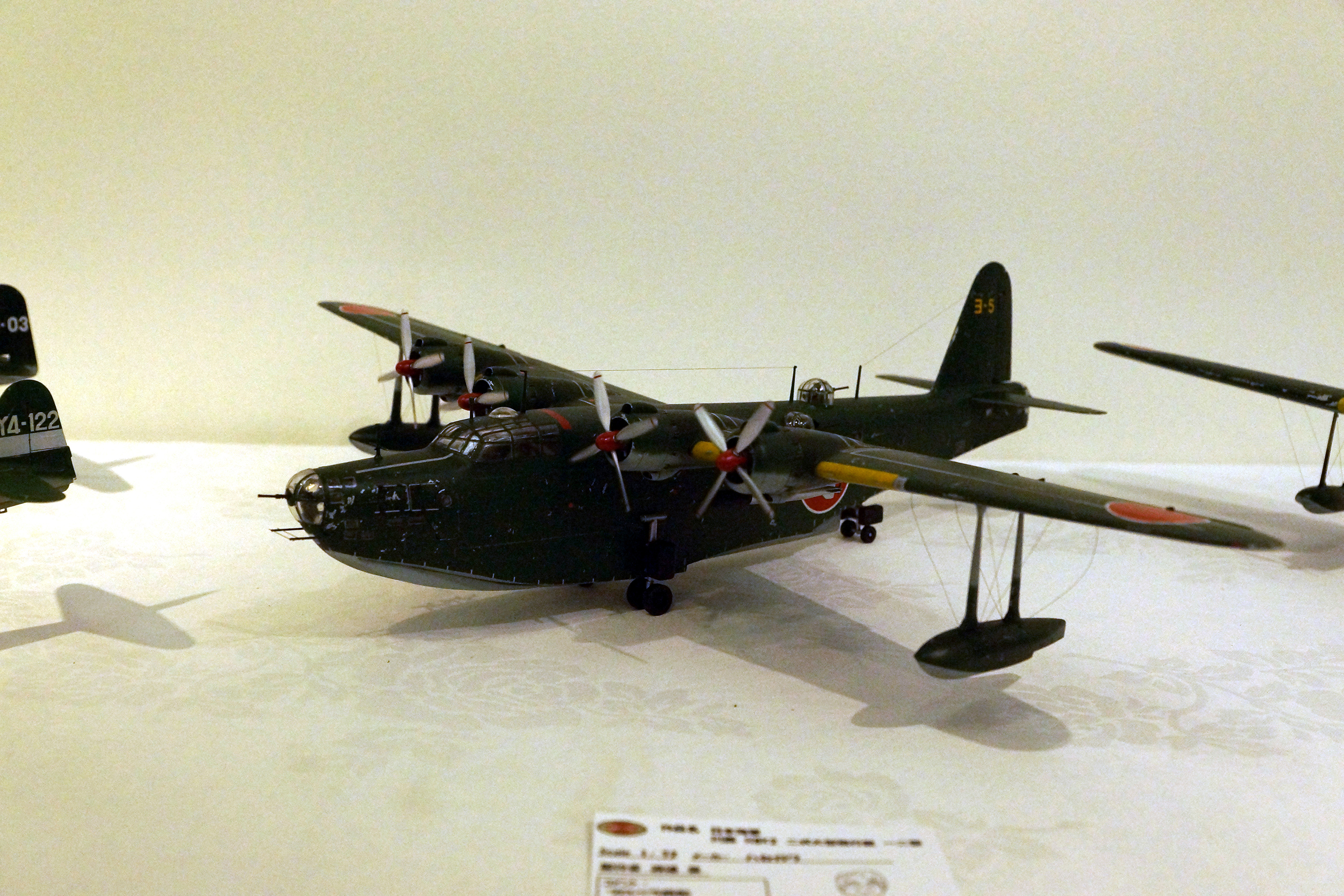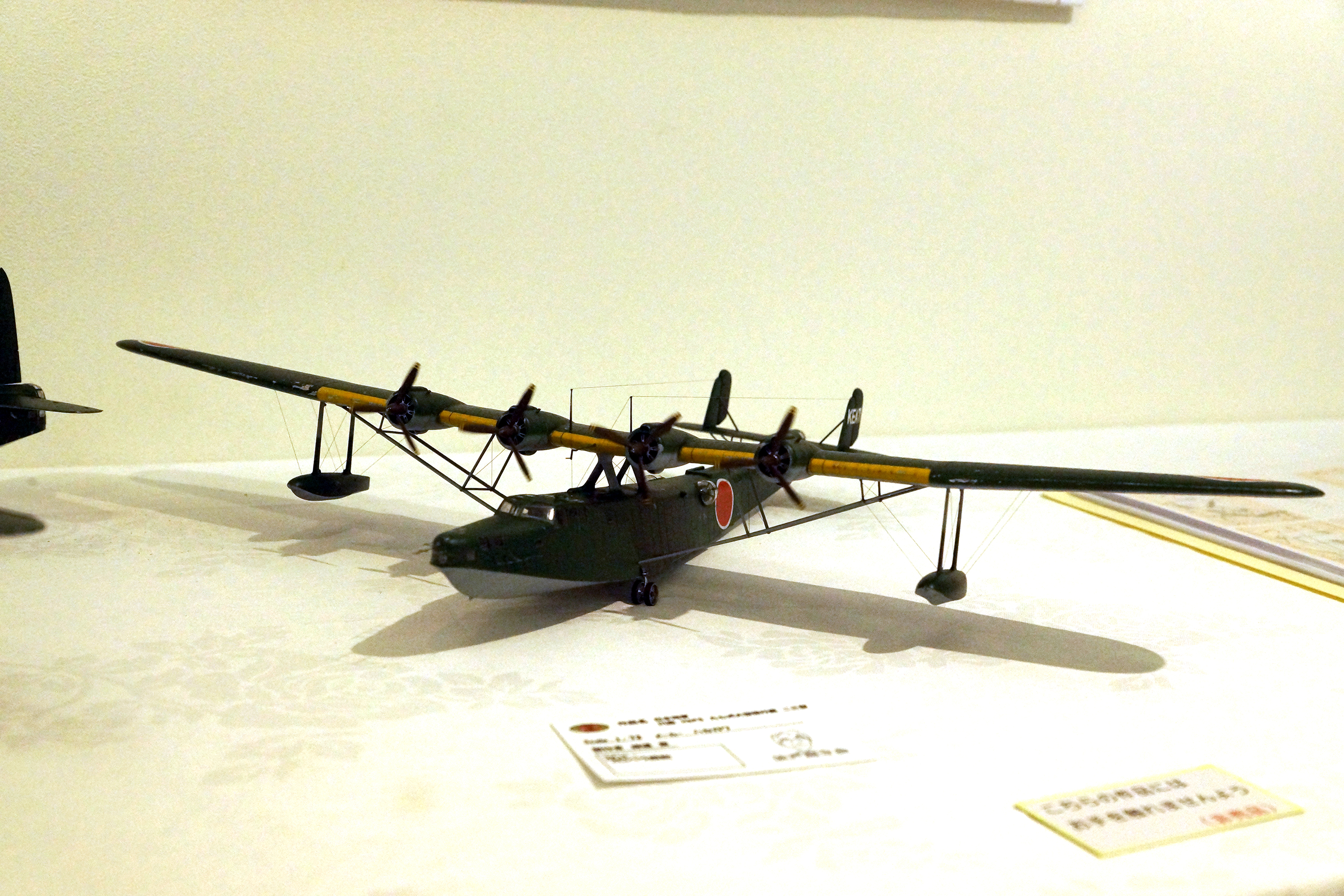 ハセガワ製 二式大艇 十二型。回転しているプロペラの電源は後部銃座を抜くと電池が交換できる業物。