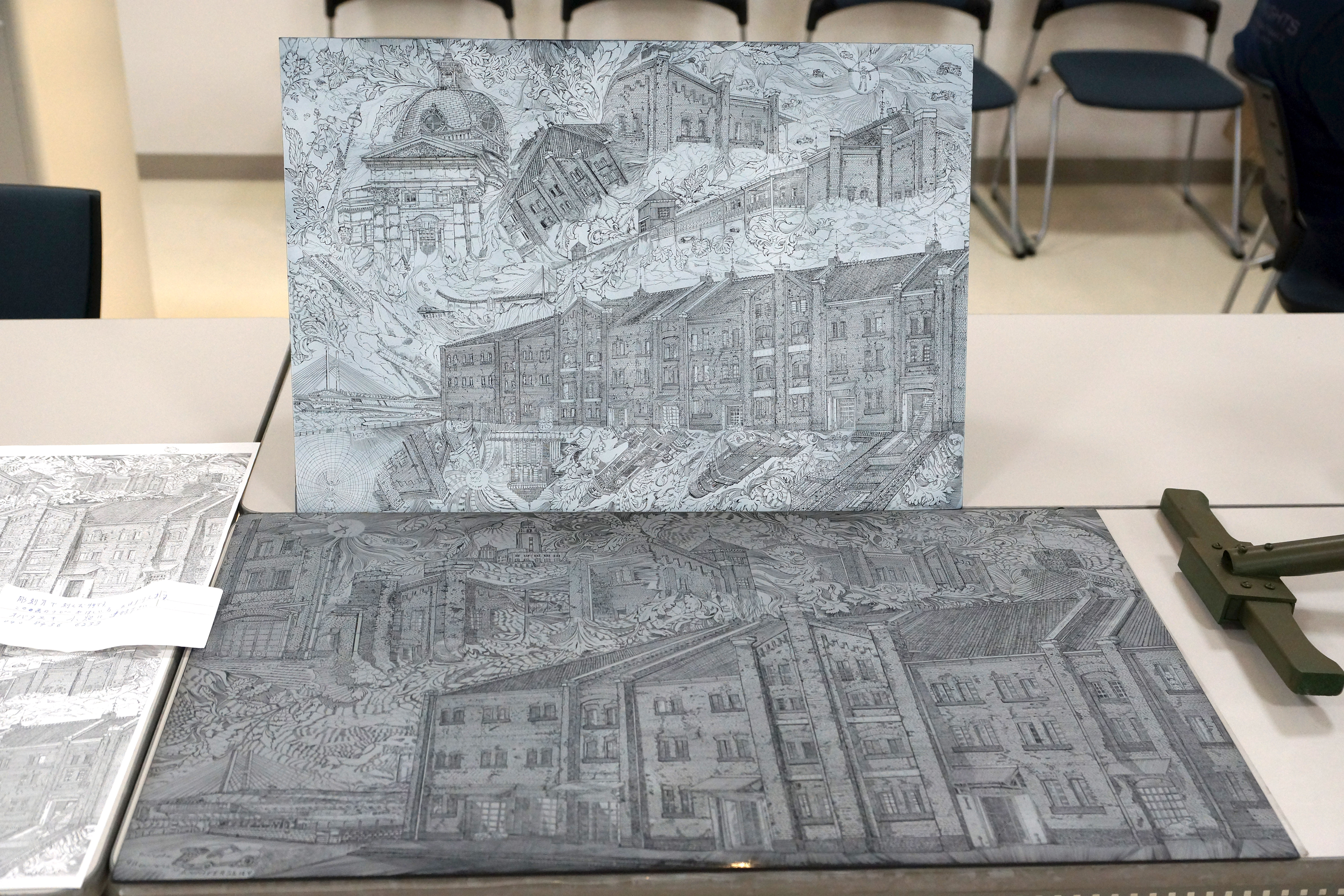 版画の原版を持ってきていたゲスト参加の方。隣には1:1スケールのガトリングガンやリボルバーがありました。